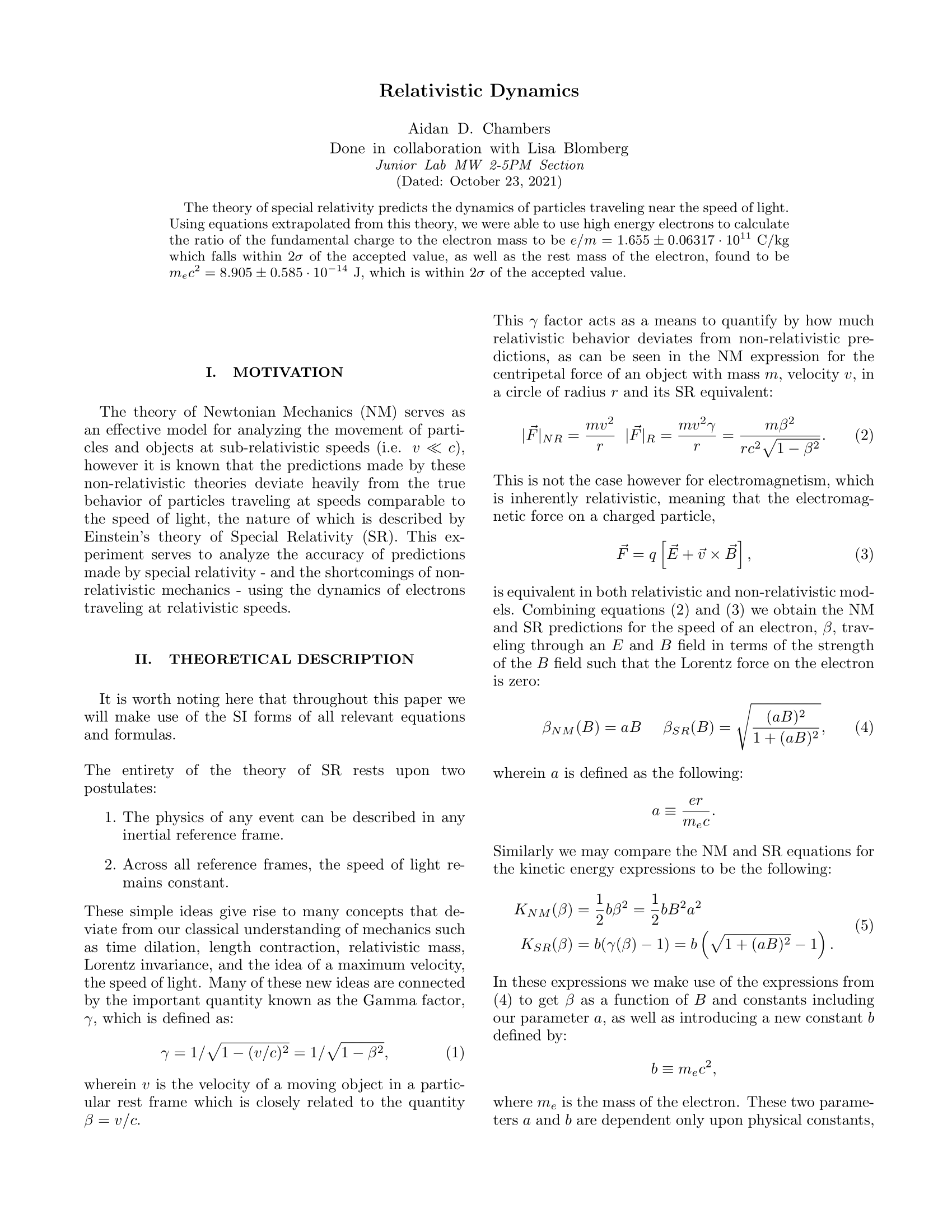 This is the first of three papers written for 8.13, which is MIT's Experimental Physics I or Junior Lab course. This experiment focuses on analyzing the motion of near light-speed electrons and comparing our observed kinematics to predictions from Special Relativity.